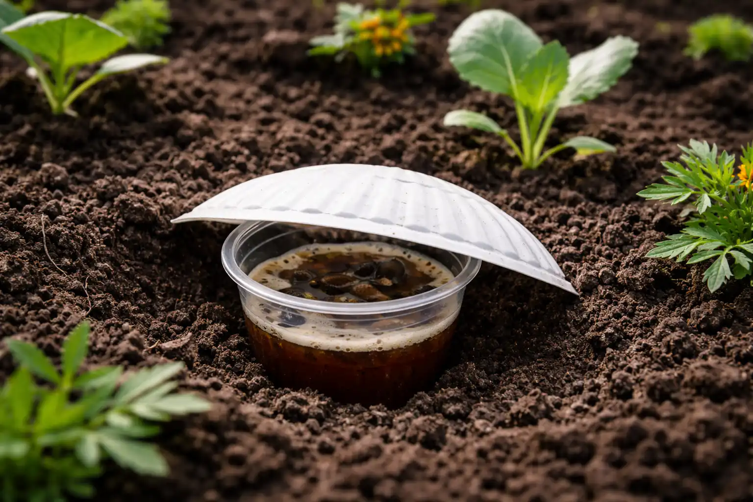 • Kaivaa pienet muovikupit tasaisesti maan kanssa. • Täytä niistä kolmasosa tummalla oluella tai veden, hiivan ja sokerin seoksella. • Peitä yläosa puolikkaalla kertakäyttölautasella estääksesi sateen. • Tarkista ja puhdista astiat joka aamu.