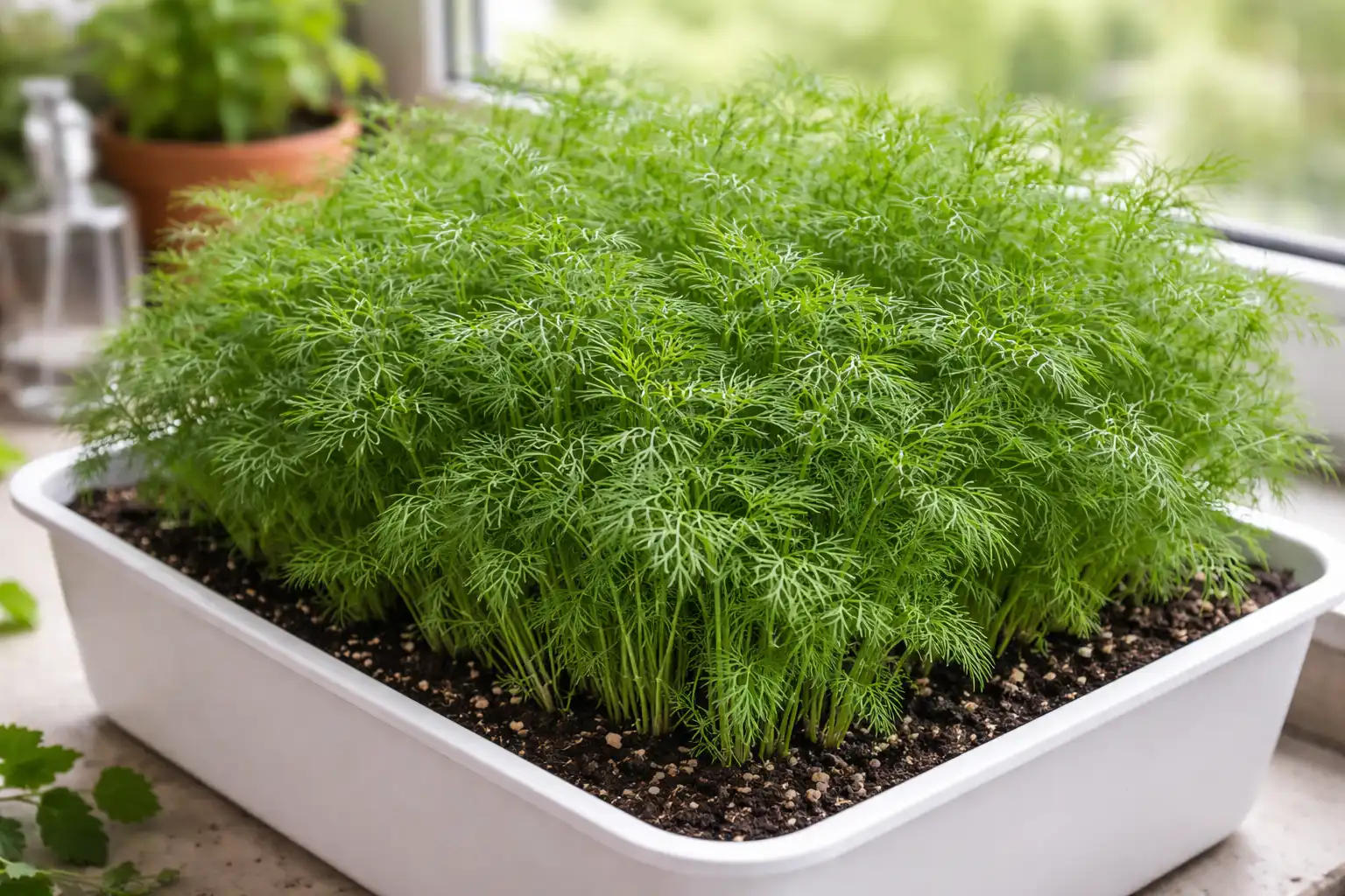 ”Muista: tilli ei pelkää viileää säätä, mutta se vihaa lämpöpattereiden kuivaa ilmaa. Pidä ikkuna mikrotuuletusta varten, niin vihreistä tulee mehukkaita ja aromaattisia.”