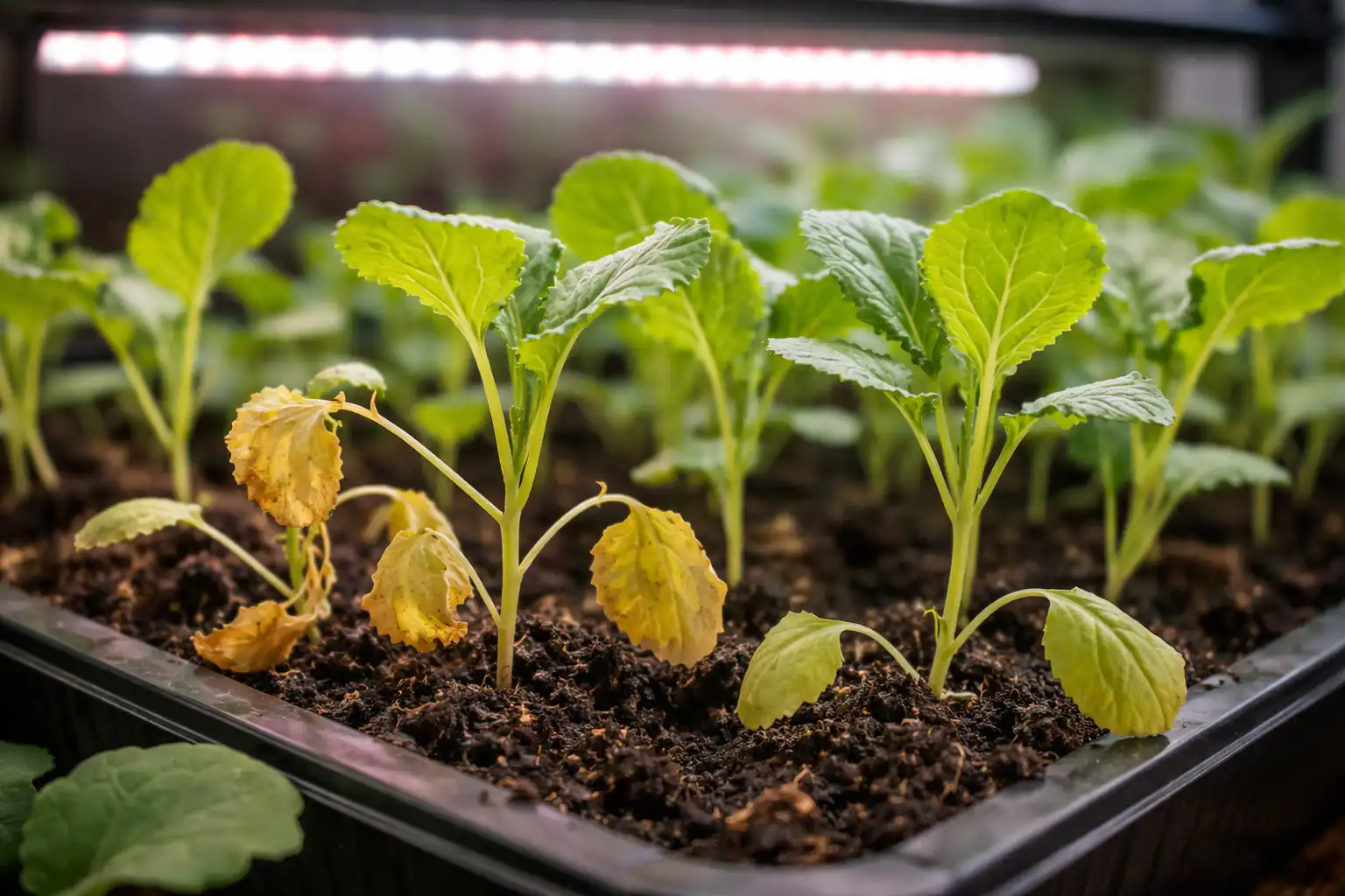 Kun taimet seisovat pohjoisikkunassa tai huoneen takaosassa, he käyttävät kaikki resurssit siihen valonlähdettä etsimässä. Tämän seurauksena kudokset ohenevat ja jopa pieni lämpötilan nousu huoneessa johtaa kosteuden haihtumiseen nopeammin kuin juuret pystyvät pumppaamaan sitä ylös. Tämä on suora tie koko istutusmateriaalierän kuolemaan.