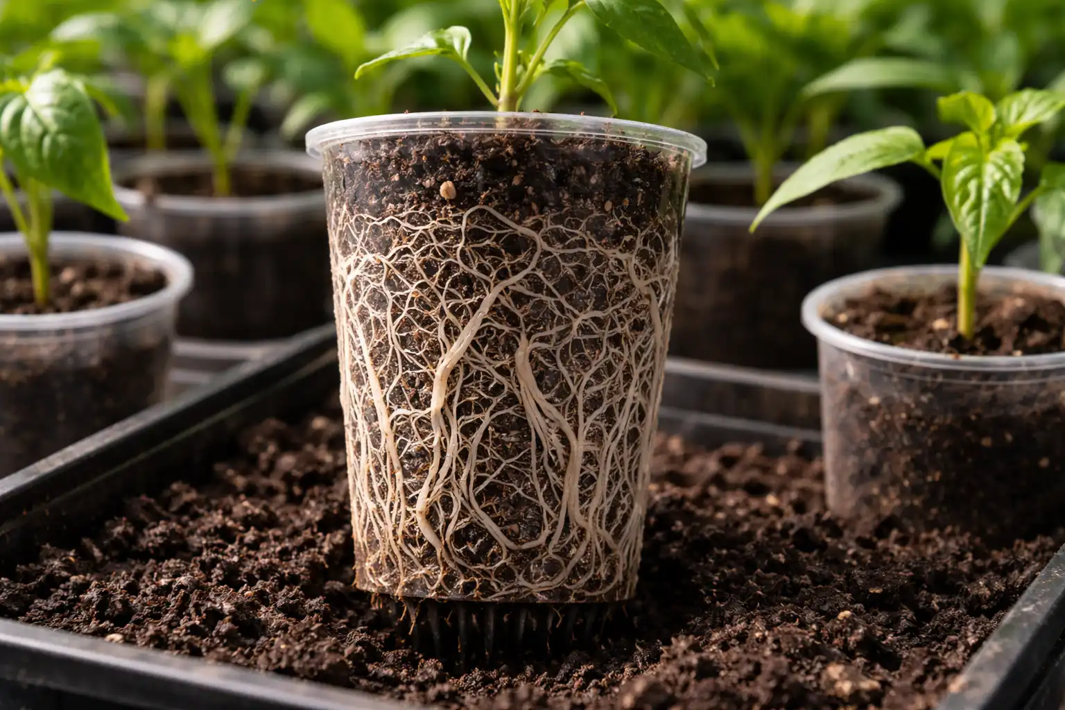 Suuressa ruukussa pippurin juuret pyrkivät saavuttamaan seinät mahdollisimman nopeasti ”lävistämällä” tyhjän tilan. Ahtaassa lasissa juuri pakotetaan haarautumaan täyttäen substraatin jokaisen millimetrin imukarvat.