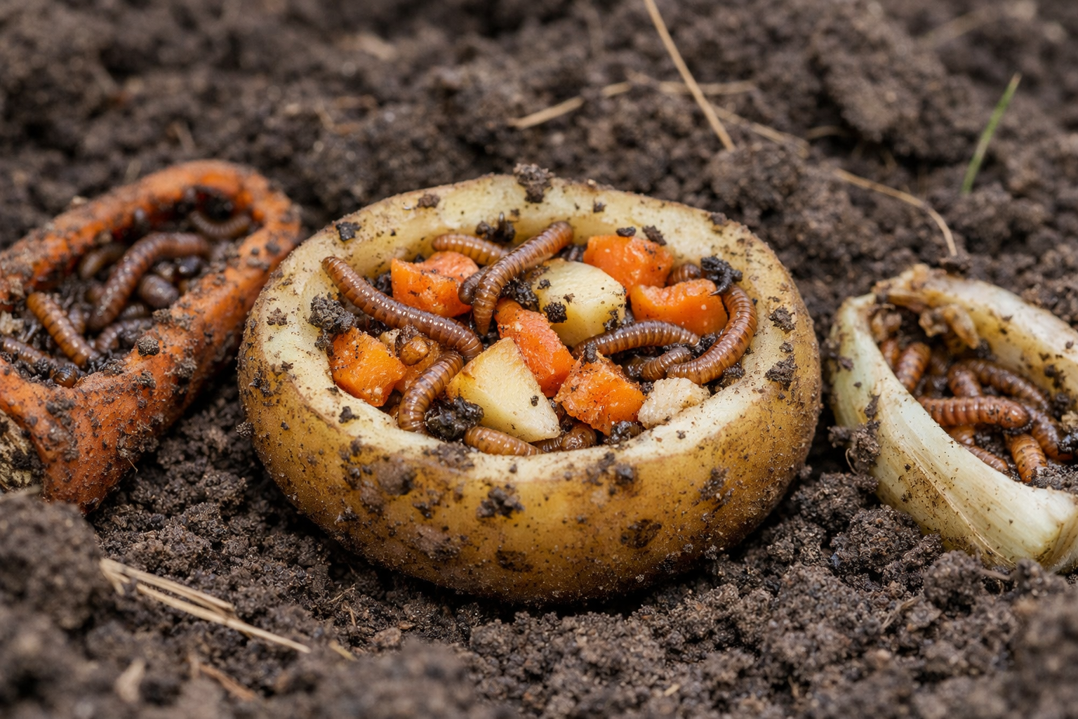 Syötin käyttäminen: perunoiden tai porkkanoiden puolikkaat haudattu syvälle 10 senttimetriä.