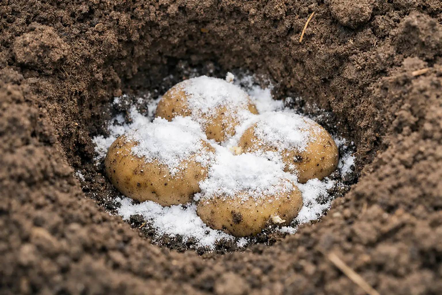 Salainen vivahde: älä koskaan kaada soodaa ”silmällä” suoraan mukulan päälle. Välttääksesi herkkien versojen palamisen, sekoita se kuivaan hiekkaan tai puutuhkaan suhteessa yksi yhteen. Tämä luo pehmeän suojaavan kotelon perunan ympärille.