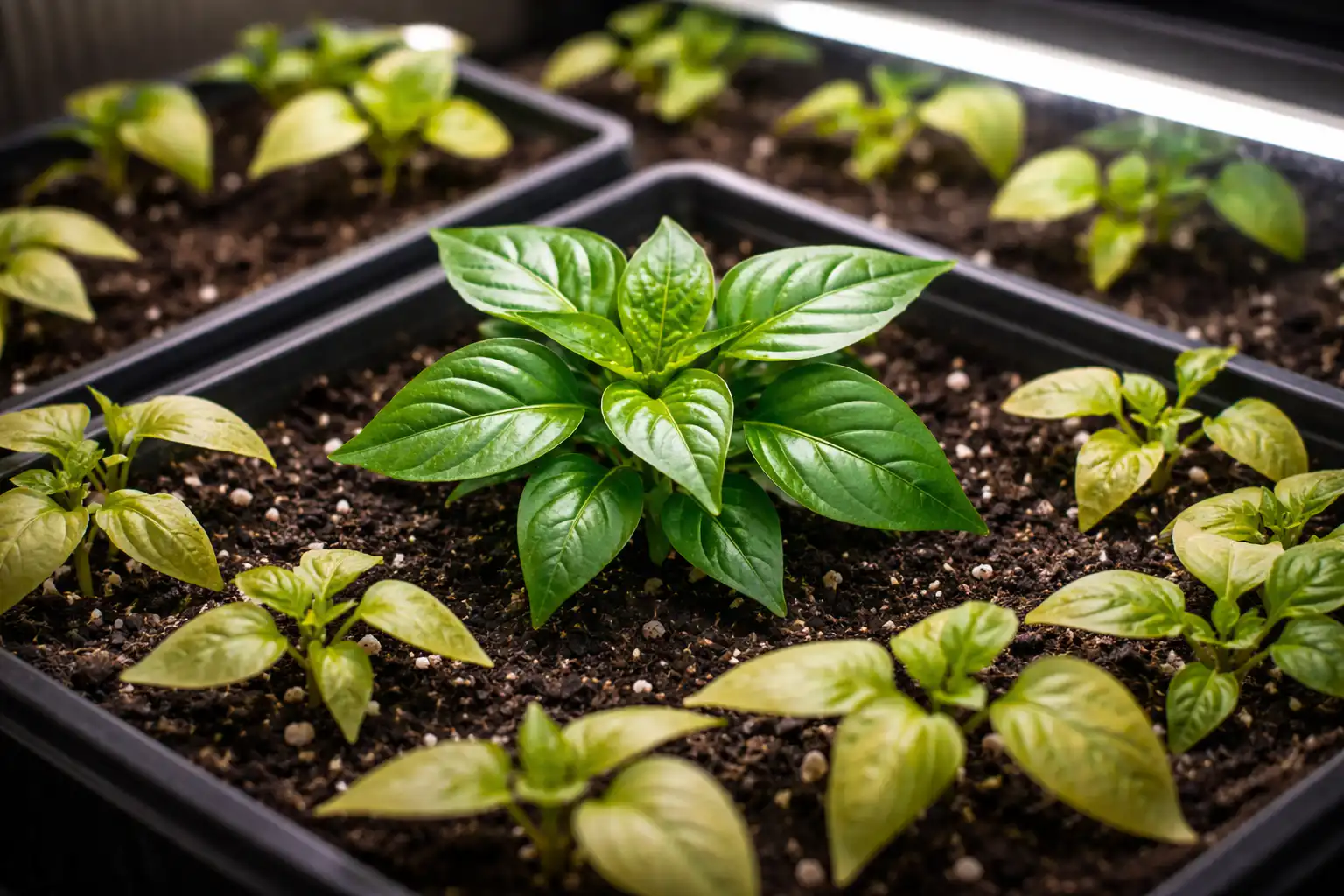 Salainen vivahteeni: jos taimet alkavat vaalentaa, ei riitä, että siirrät ne vain aurinkoon. Laitos tarvitsee rakennusmateriaalia klorofyllin palauttamiseksi – rautakelaatti tai magnesium. Ilman niitä, jopa fytolampun alla, pippuri pysyy vaaleana pitkään.