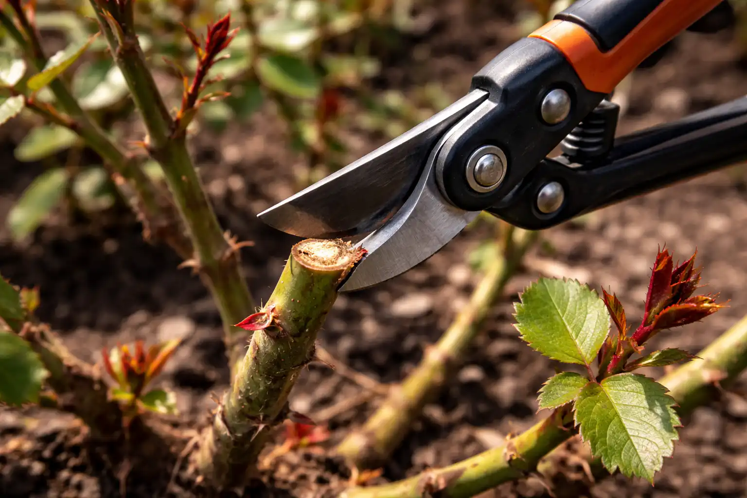 Avain menestykseen on oikea työkalu. Käytän aina vain teroitettuja ohitusleikkurijoka tekee puhtaan leikkauksen murskaamatta varren kudosta. Jos jätät repeytyneet reunat, infektio pääsee välittömästi sinne ja ruusu alkaa muuttua mustaksi ylhäältä alas.