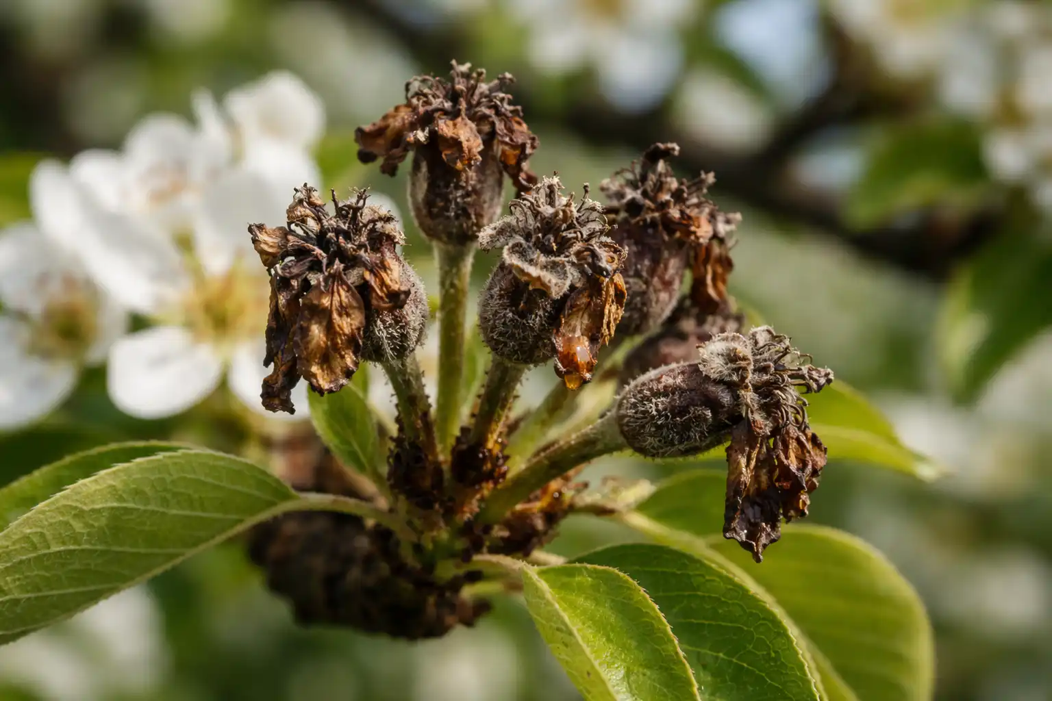 Jos puu näyttää hiiltyneeltä ja kukat roikkuvat kuin mustat lumput, olet todennäköisesti kohtaamassa bakterioosi. Tämä on vaarallinen tauti, joka leviää hyönteisten ja tuulen välityksellä. Tässä tapauksessa tavanomaiset fungisidit eivät auta; tarvitaan radikaalimpaa lähestymistapaa, jossa käytetään erikoistuneita biologisia aineita.