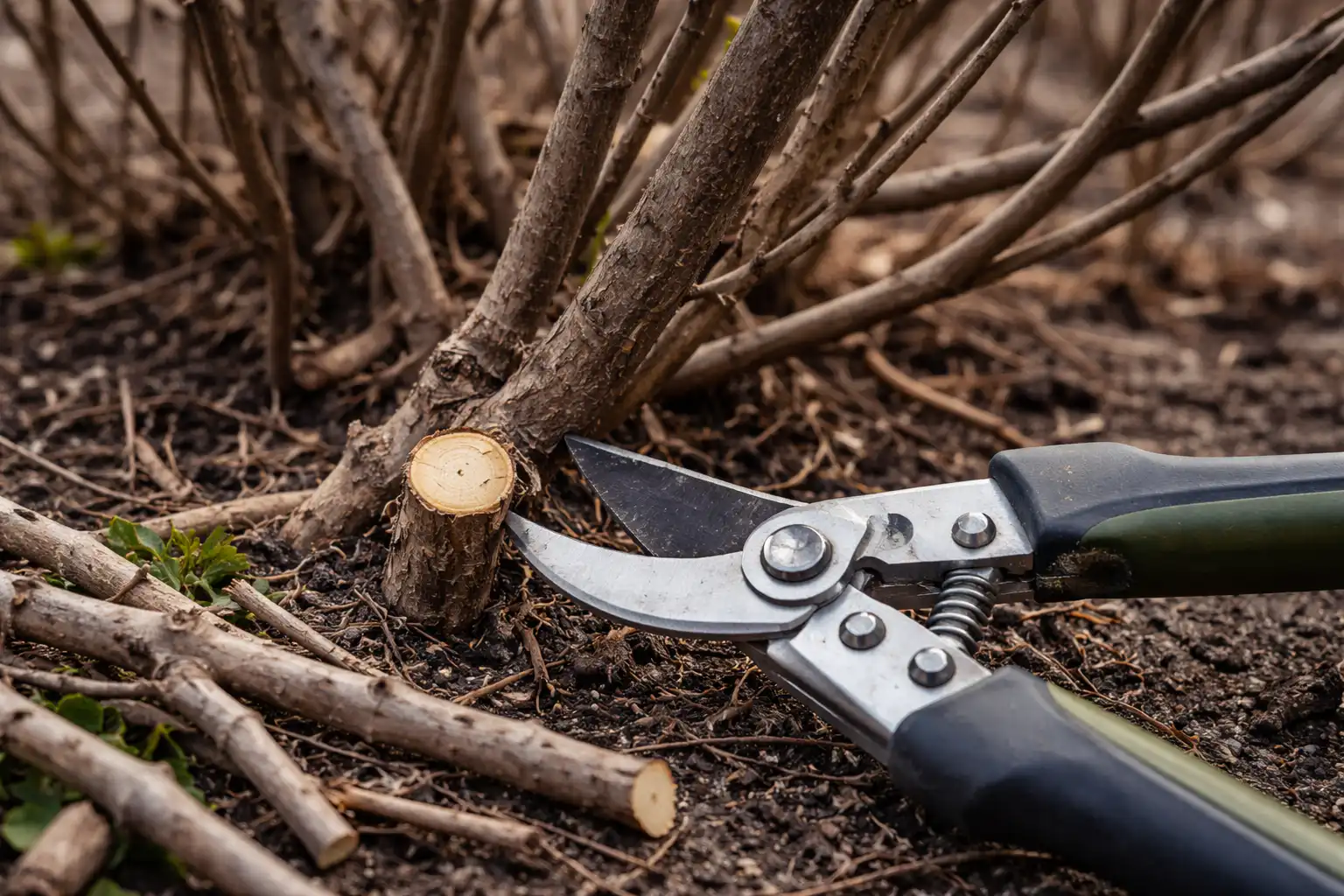 ”Älä koskaan jätä kantoja taakse, kun irrotat paksuja oksia. Leikkaa ”rengas” niin, että puu kiristyy tasaisesti. Kannot usein mätänevät ja niistä tulee tuholaisia, jotka tuhoavat koko pensaan.”